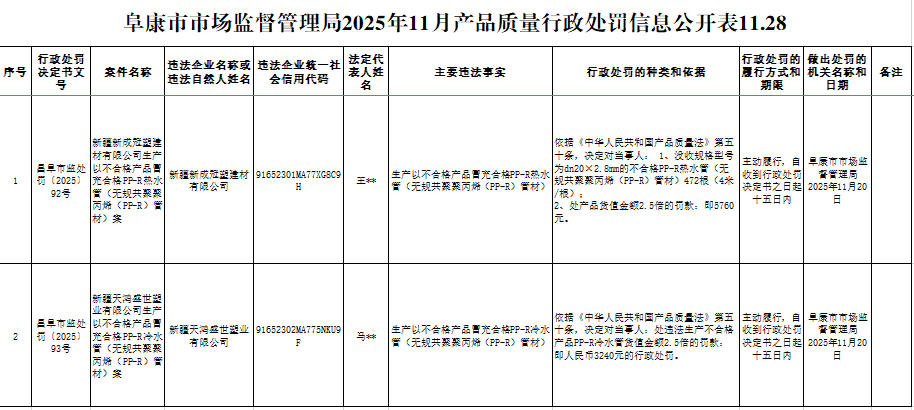 【产品质量案件】阜康市市场监督管理局2025年11月产品质量行政处罚信息公开表11.28