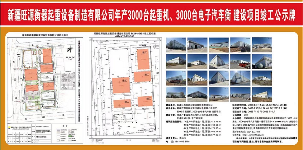 新疆旺源衡器起重设备制造有限公司年产3000台起重机、3000台电子汽车衡建设项目竣工公示牌