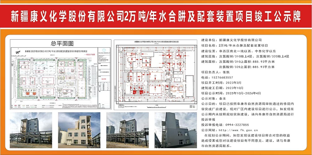新疆康义化学股份有限公司2万吨/年水合肼及配套装置项目竣工公示牌