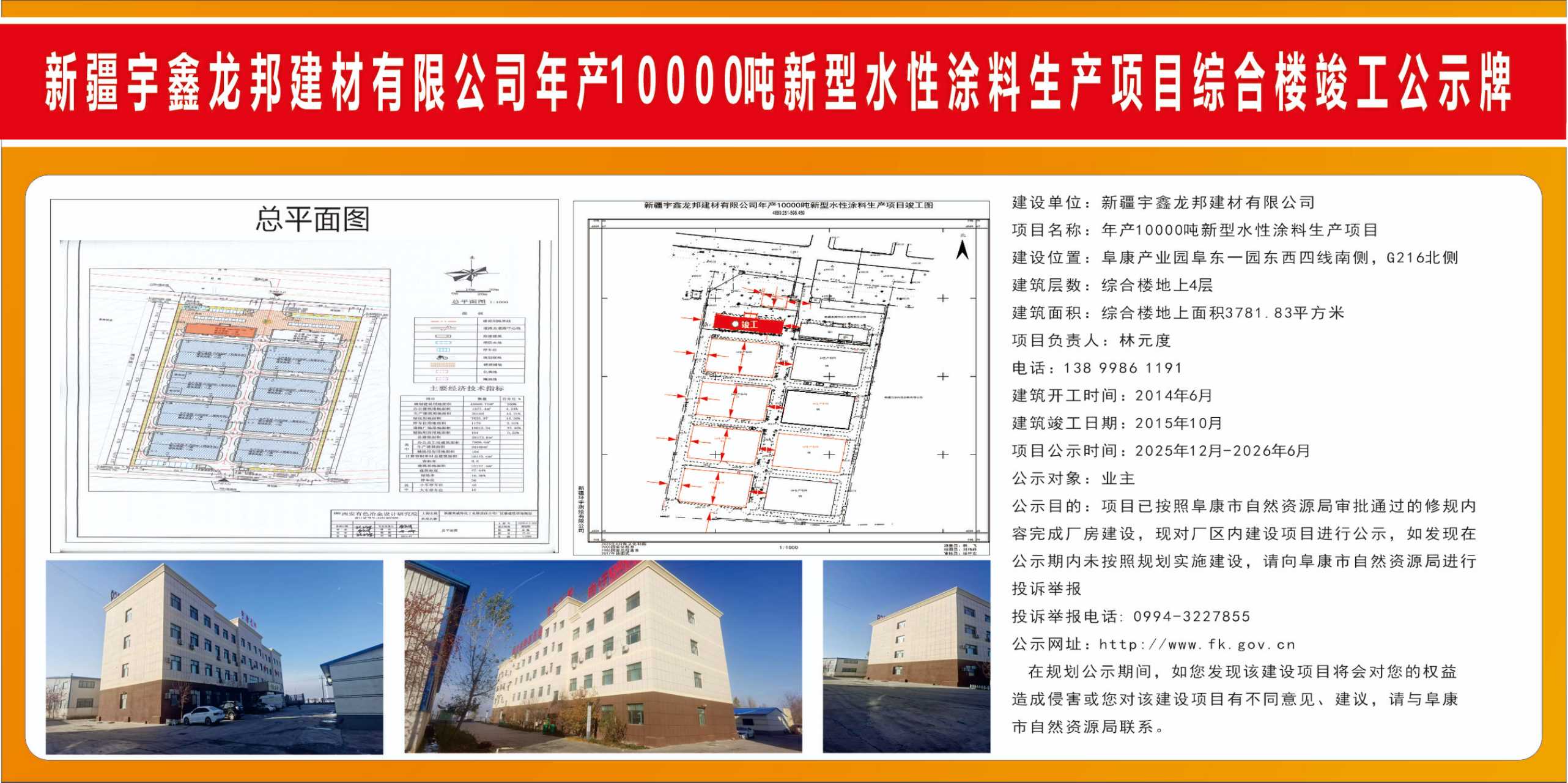 新疆宇鑫龙邦建材有限公司年产10000吨新型水性涂料生产项目综合楼竣工公示牌