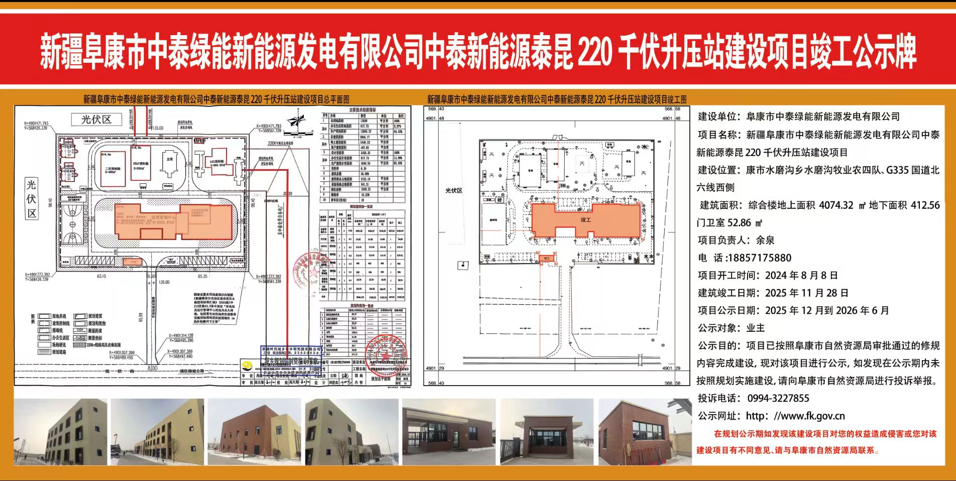 新疆阜康市中泰绿能新能源发电有限公司中泰新能源泰昆220千伏升压站建设项目竣工公示牌