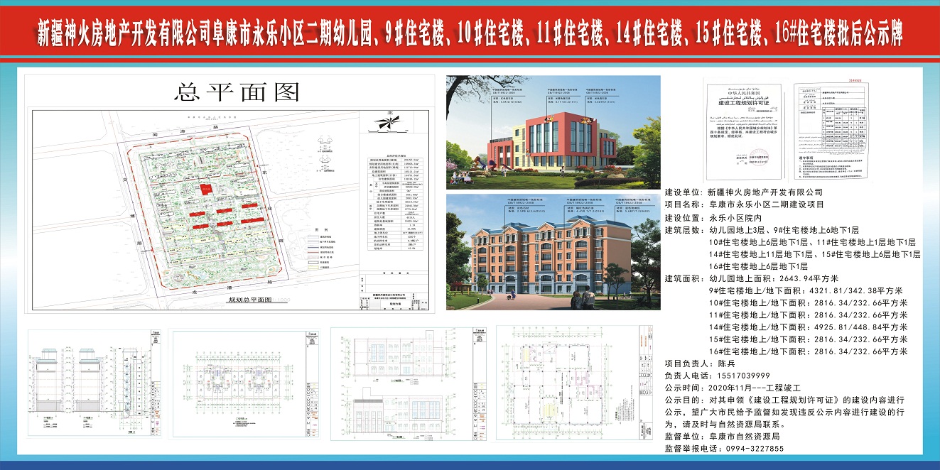 新疆神火房地产开发有限公司阜康市永乐小区二期幼儿园、9#住宅楼、10#住宅楼、11#住宅楼、14#住宅楼、15#住宅楼、16#住宅楼批后公示牌