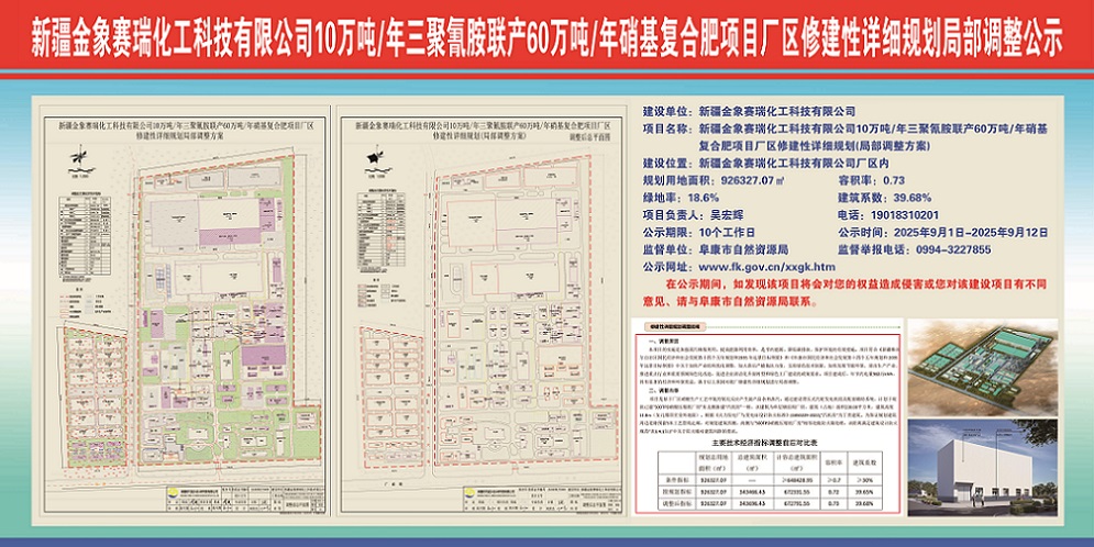 新疆金象瑞化工科技有限公司10万吨/聚氰胺联产60万吨/年硝基复合肥项目厂区修建性详细规划局部调整公示