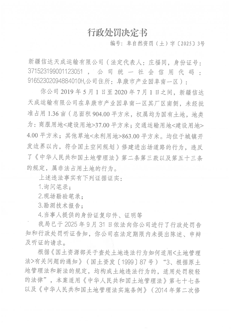 【行政处罚】新疆信达天成运输有限公司行政处罚公示