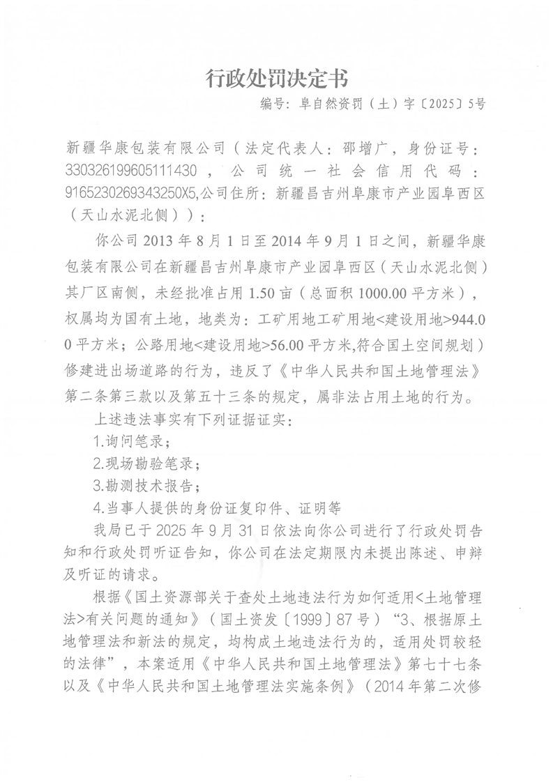 【行政处罚】新疆华康包装有限公司行政处罚公示