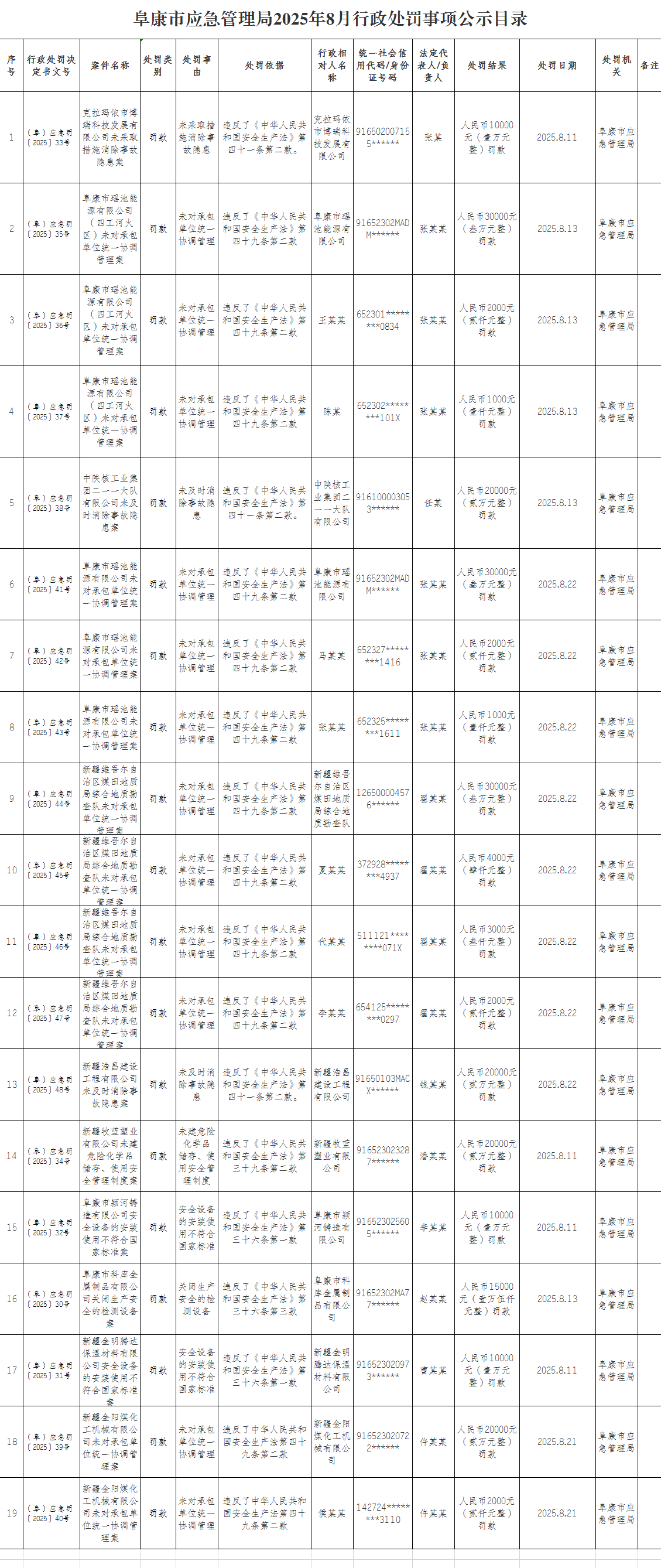 [行政处罚]阜康市应急管理局2025年8月行政处罚事项公示目录