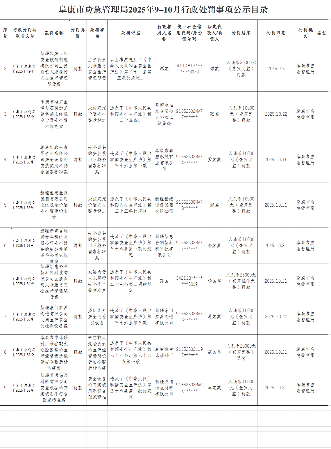 [行政处罚]阜康市应急管理局2025年9-10月行政处罚事项公示目录