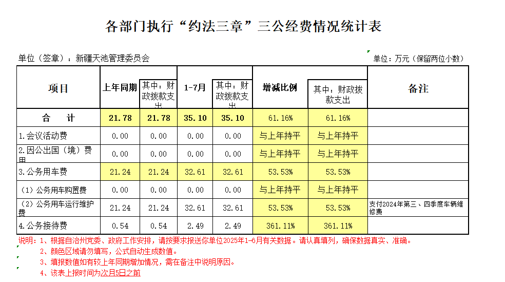 | 名 称 | 2025年天池管委会执行”约法三章“三公经费情况统计表(7月) | ||