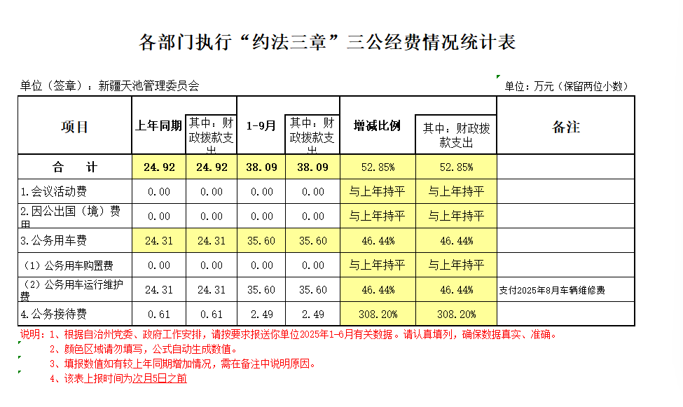 | 名 称 | 2025年天池管委会执行”约法三章“三公经费情况统计表(9月) | ||