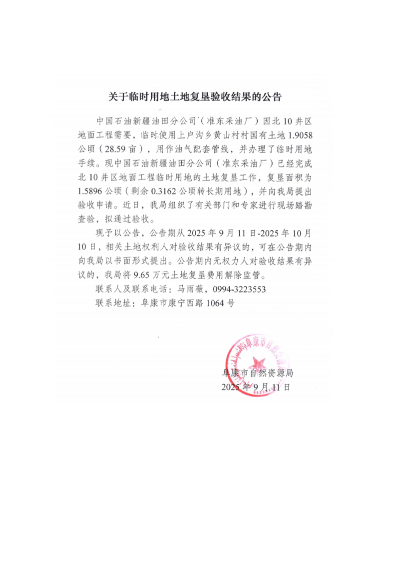 | 名 称 | 关于临时用地土地复垦验收结果的公告(北10井区地面工程) | ||