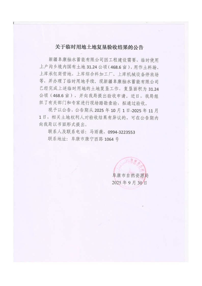 关于临时用地土地复垦验收结果的公告(新疆阜康抽水蓄能有限公司工程建设临时用地土地复垦)