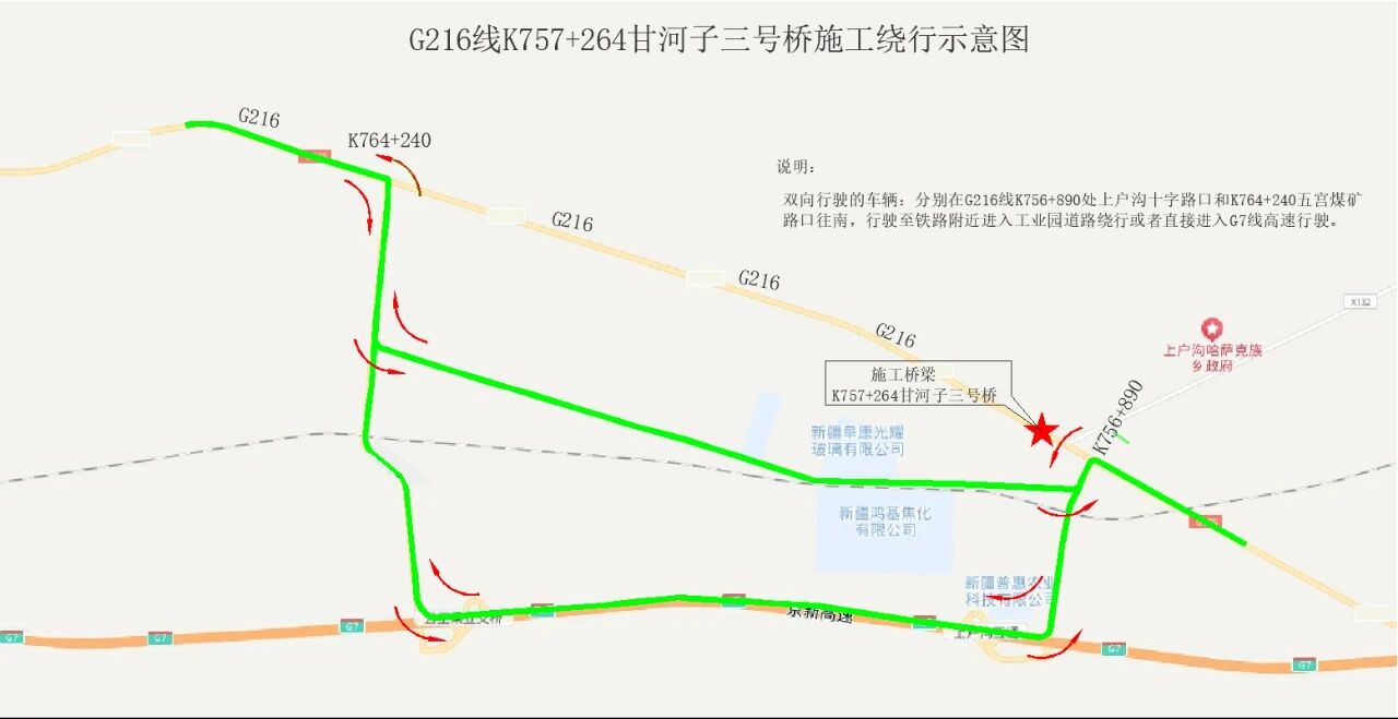 (二)从甘河子方向至阜康行驶的车辆将从K756+890处上户沟十字路口左转,行驶至铁路附近进入工业园道路绕行或者直接进入G7线高速行驶。四、温馨提示道路施工期间,车辆注意安全,减速慢行,服从公安交警及施工单位的统一指挥,严格遵守道路交通各项法律法规。因道路施工给群众出行带来的不便,敬请谅解。