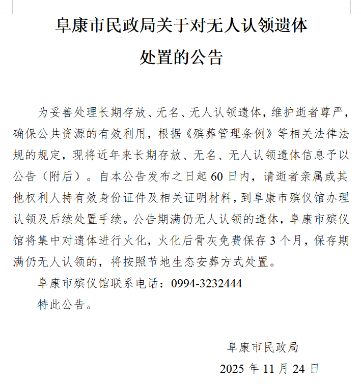 关于对无人认领遗体处置的公告