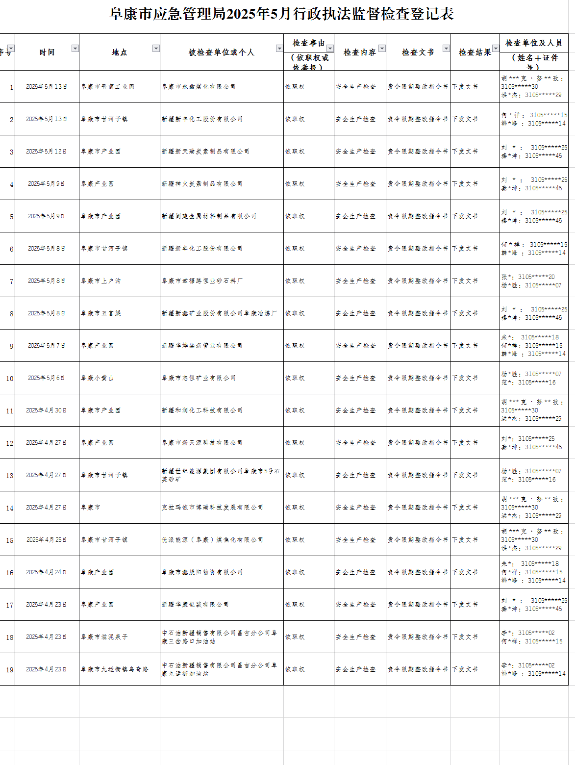 阜康市应急管理局2025年5月行政执法监督检查登记表