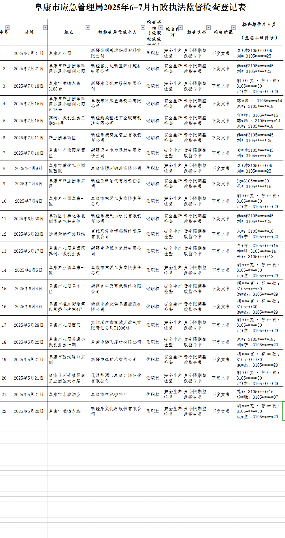 阜康市应急管理局2025年6-7月行政执法监督检查登记表