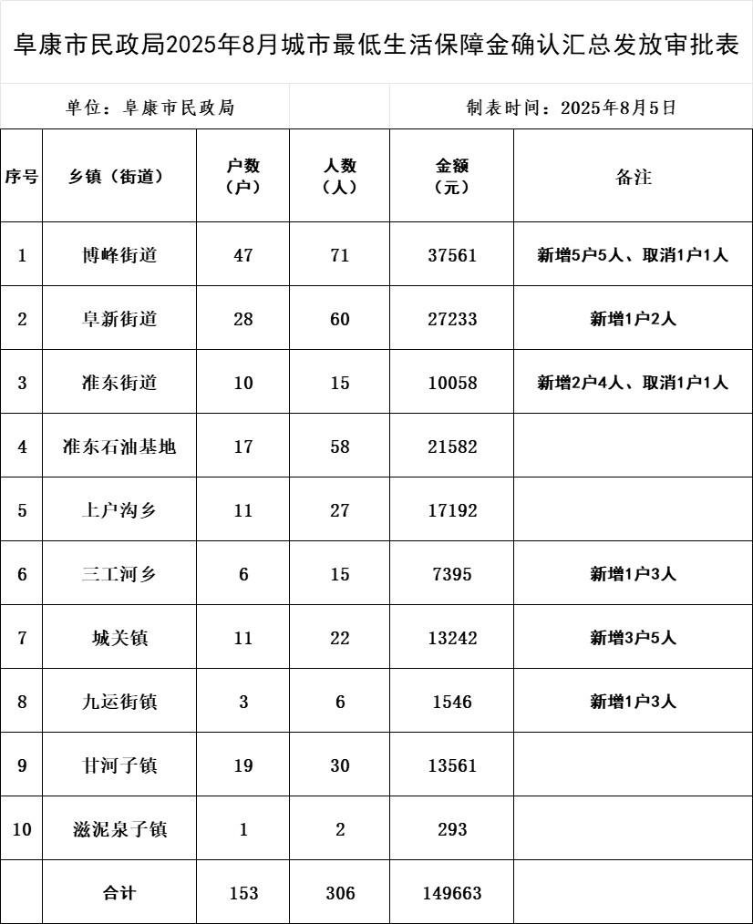 【低保发放】阜康民政局关于2025年8月城市低保发放表