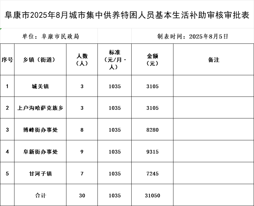 【特困补助】阜康民政局关于2025年8月城市集中特困发放表