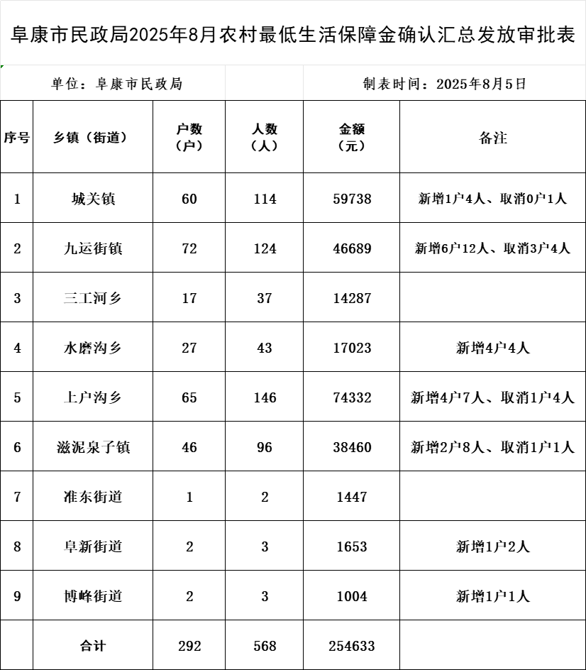 【低保发放】阜康民政局关于2025年8月农村低保发放表