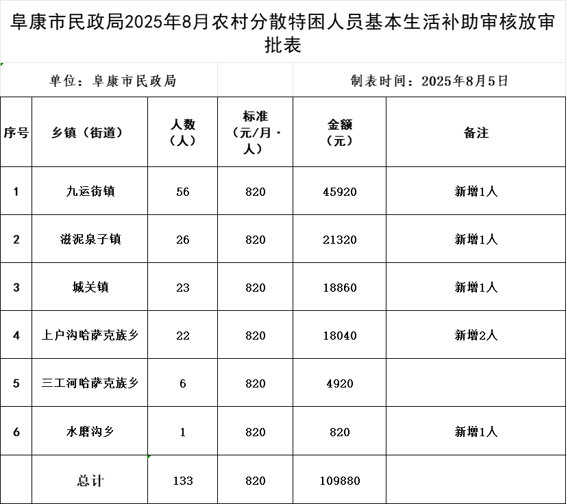 【特困补助】阜康民政局关于2025年8月农村分散特困发放表