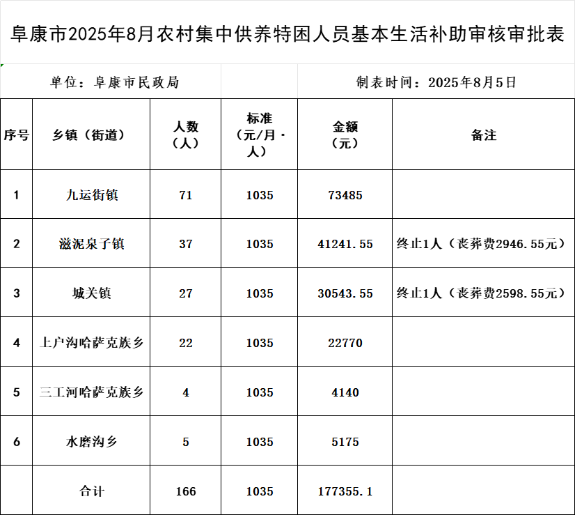 【特困补助】阜康民政局关于2025年8月农村集中特困发放表