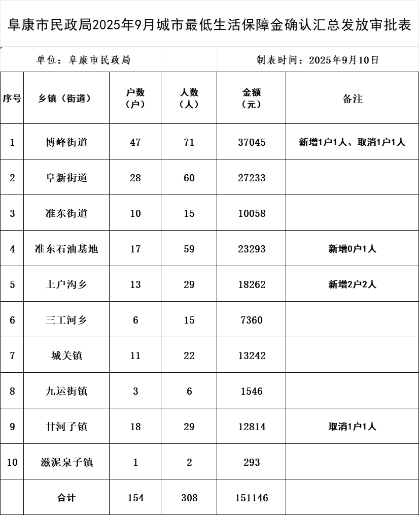 【低保发放】阜康民政局关于2025年9月城市低保发放表