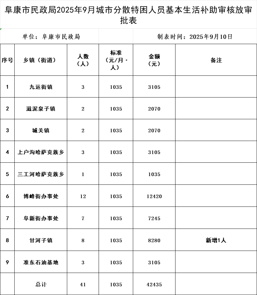 【特困补助】阜康民政局关于2025年9月城市分散特困发放表