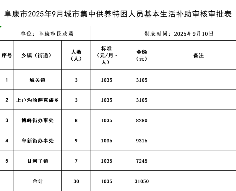 【特困补助】阜康民政局关于2025年9月城市集中特困发放表