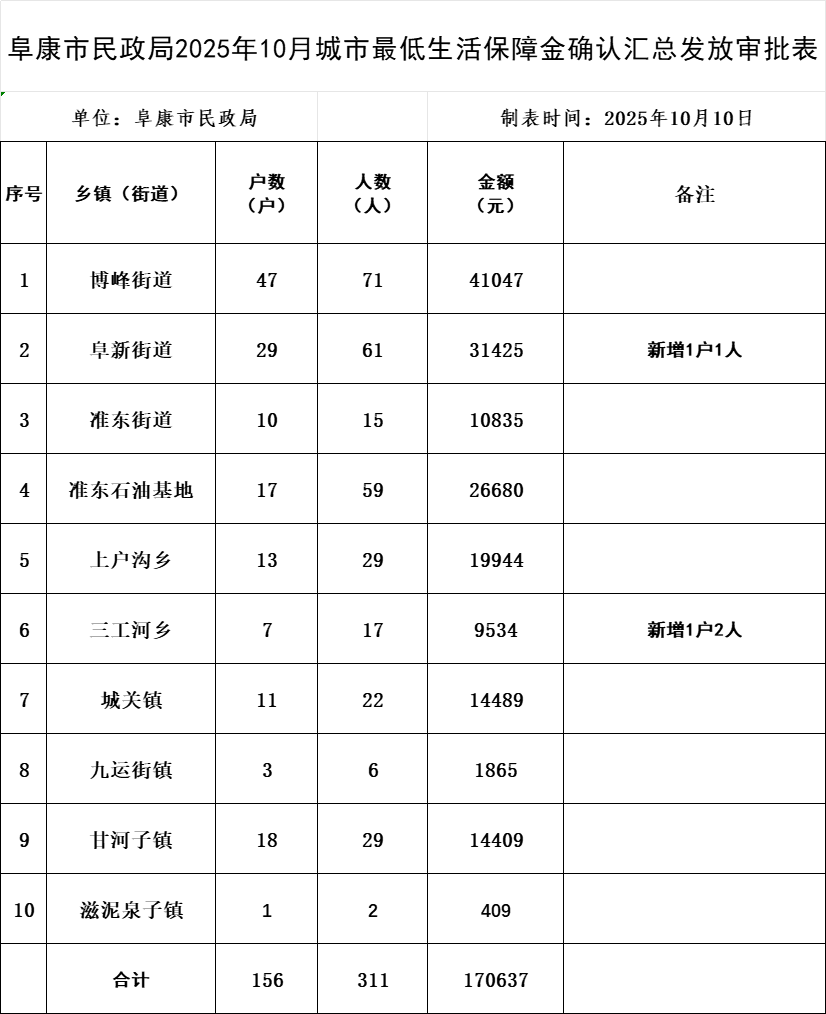 【低保发放】阜康民政局关于2025年10月城市低保发放表