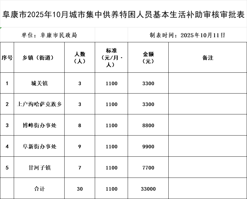 【特困补助】阜康民政局关于2025年10月城市集中特困发放表