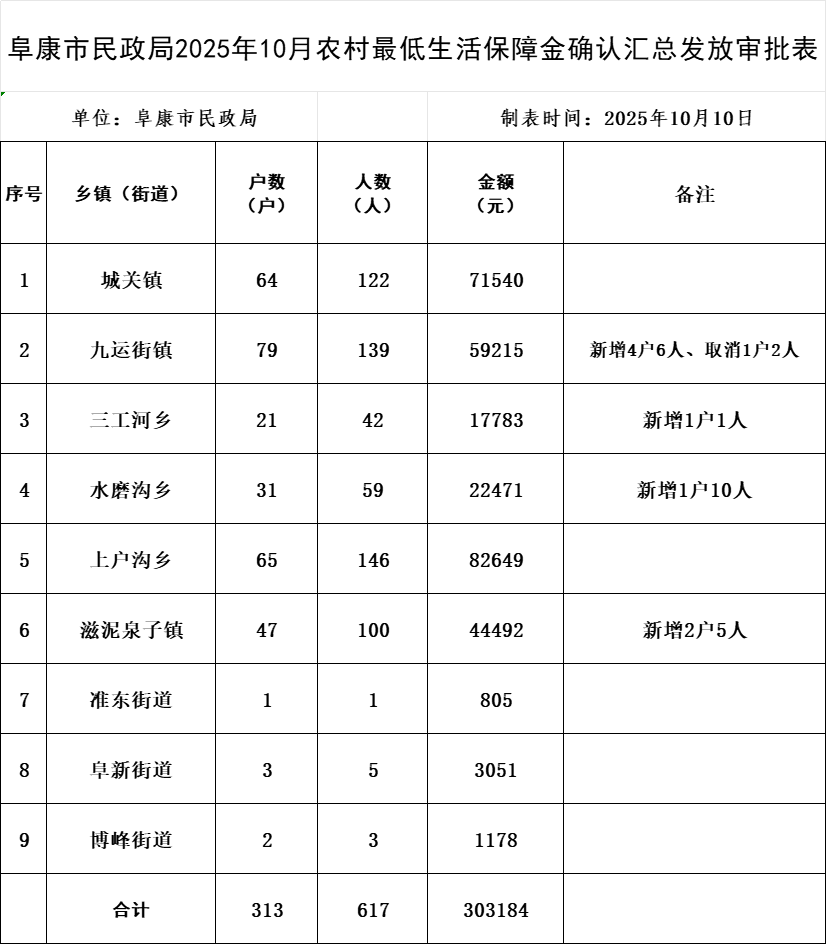 【低保发放】阜康民政局关于2025年10月农村低保发放表