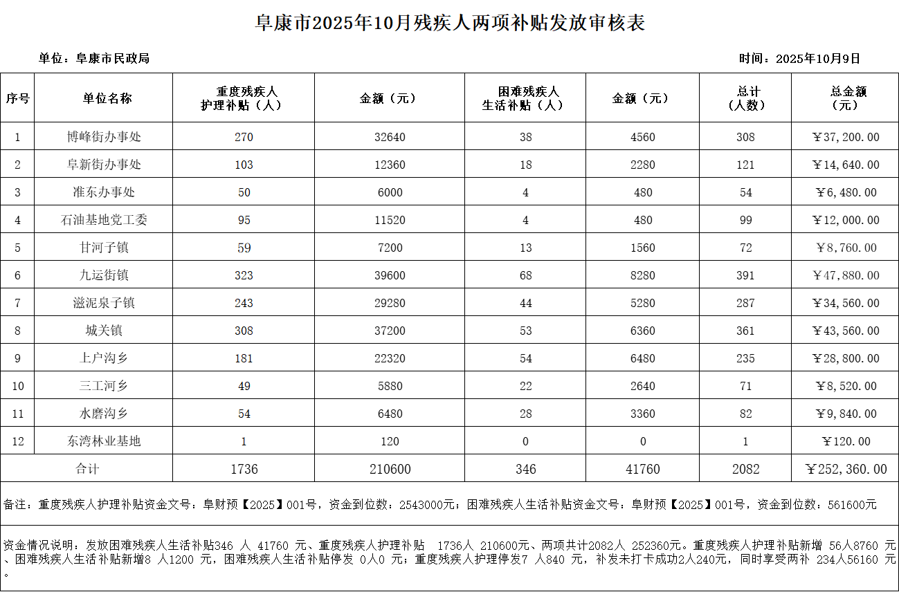 【残疾人两补】阜康民政局关于2025年10月阜康市民政局关于残疾人两补公开信息