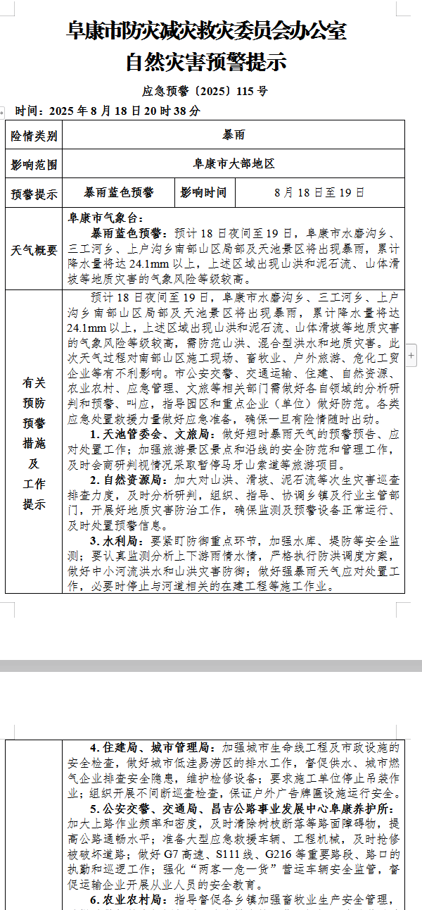 名 称 | 阜康市防灾减灾救灾委员会办公室 自然灾害预警提示 | ||