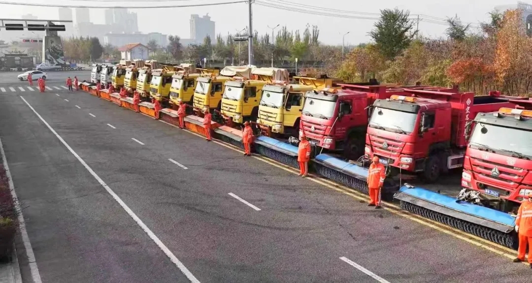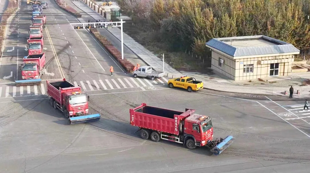 作业阶段,机械除雪车辆首先按照预定编队和路线投入作业。3台推雪车负责将主干道积雪推向道路两侧,4台滚刷车紧随其后进行清扫。对于机械车辆难以覆盖的人行道、路缘石边缘等区域,12名环卫工人使用扫帚、雪铲等工具进行人工清理。随后,2台滑移机配合运输车辆,将堆积的积雪进行装运处置。