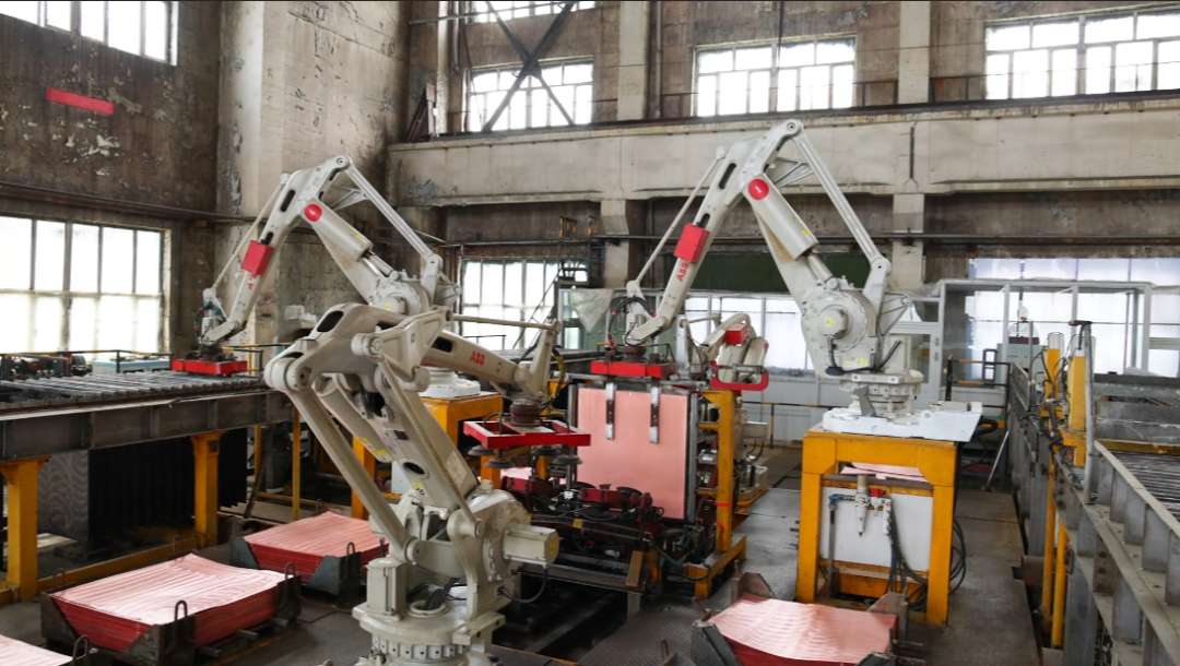 在新疆五鑫铜业电解车间内始极片剥片机组正自动化运行,机械臂精准抓取、剥离、转运始极片,实现全流程机械化操作。张鹏 摄