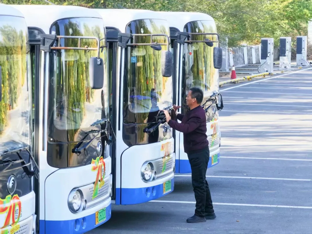 10月11日,在阜康市客运站的公交车停放点,数辆新能源公交车整齐排列,公交车师傅们一边为车辆充电,一边打扫车辆卫生、擦拭车窗。