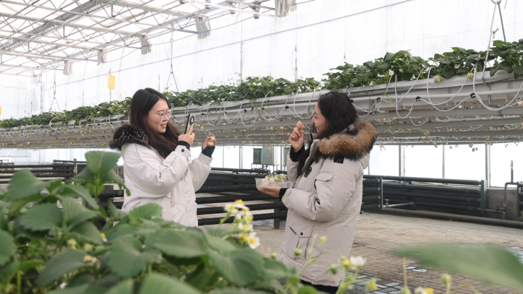 游客们在草莓采摘基地打卡拍照。魏鹏慧 摄