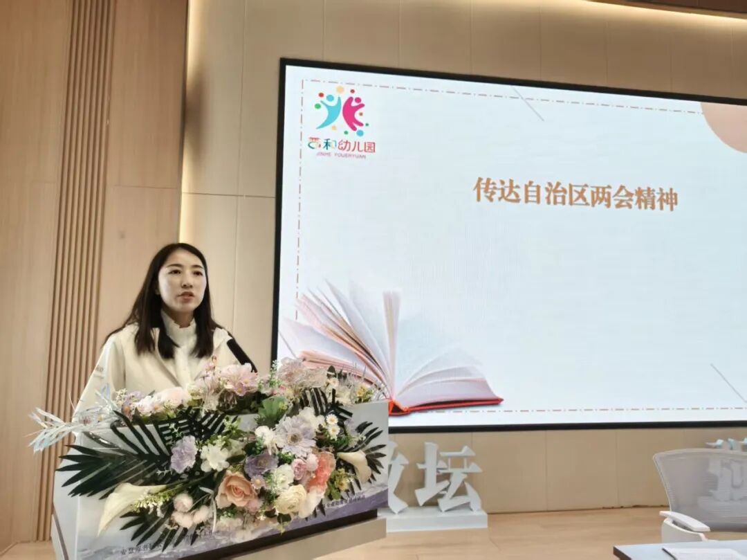 自治区人大代表、阜康市晋博幼儿园教师马晓杰以“两会精神润童心 教育初心向未来”为主题,在幼儿园教职工中开展宣讲。她聚焦自治区两会关于教育事业发展的相关要求,结合学前教育发展实际,分享了会议中关于提升学前教育质量、促进教育公平、加强师资队伍建设等方面的内容,与同事们共同探讨如何将两会精神融入日常保教工作——从优化幼儿游戏活动设计,到加强家园共育协同,再到关注幼儿身心健康发展,用爱心与责任守护幼儿健康成长。