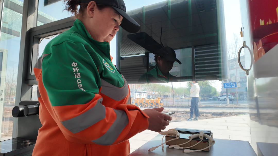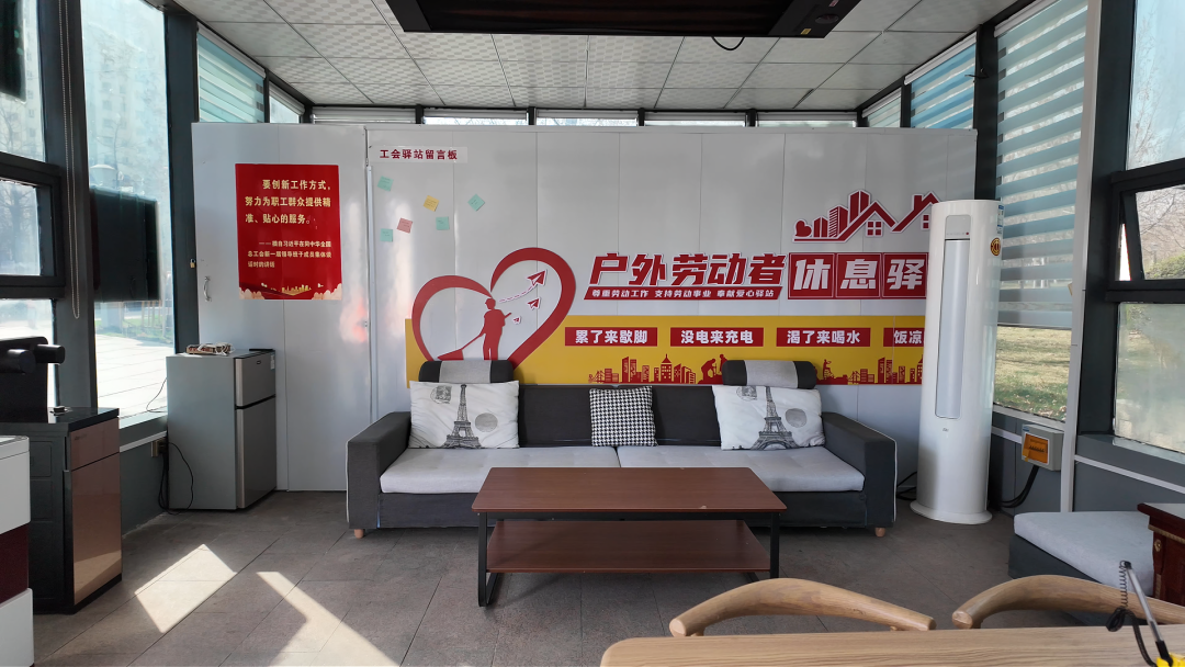 环卫工人热汉古说:“工会驿站里面可以充电、休息、喝水,我们累的时候随时可以进来歇歇脚,很方便。”