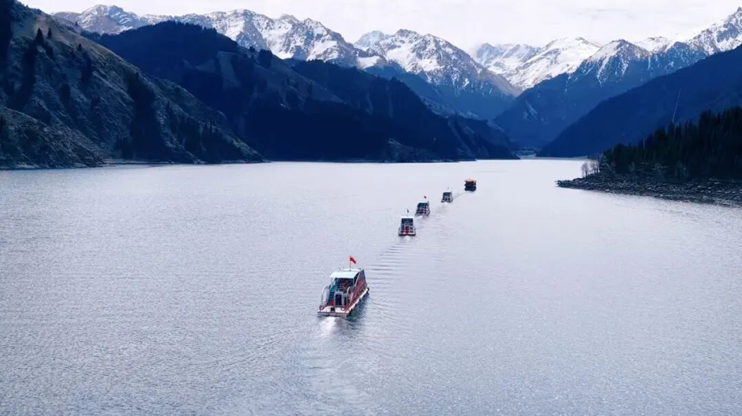冰封消融的天池澄澈如镜,博格达峰皑皑雪峰倒映水中,6艘电动游船整装待发,雪山、碧水、云杉相映成画,尽显春日高原湖泊的灵动与壮美。