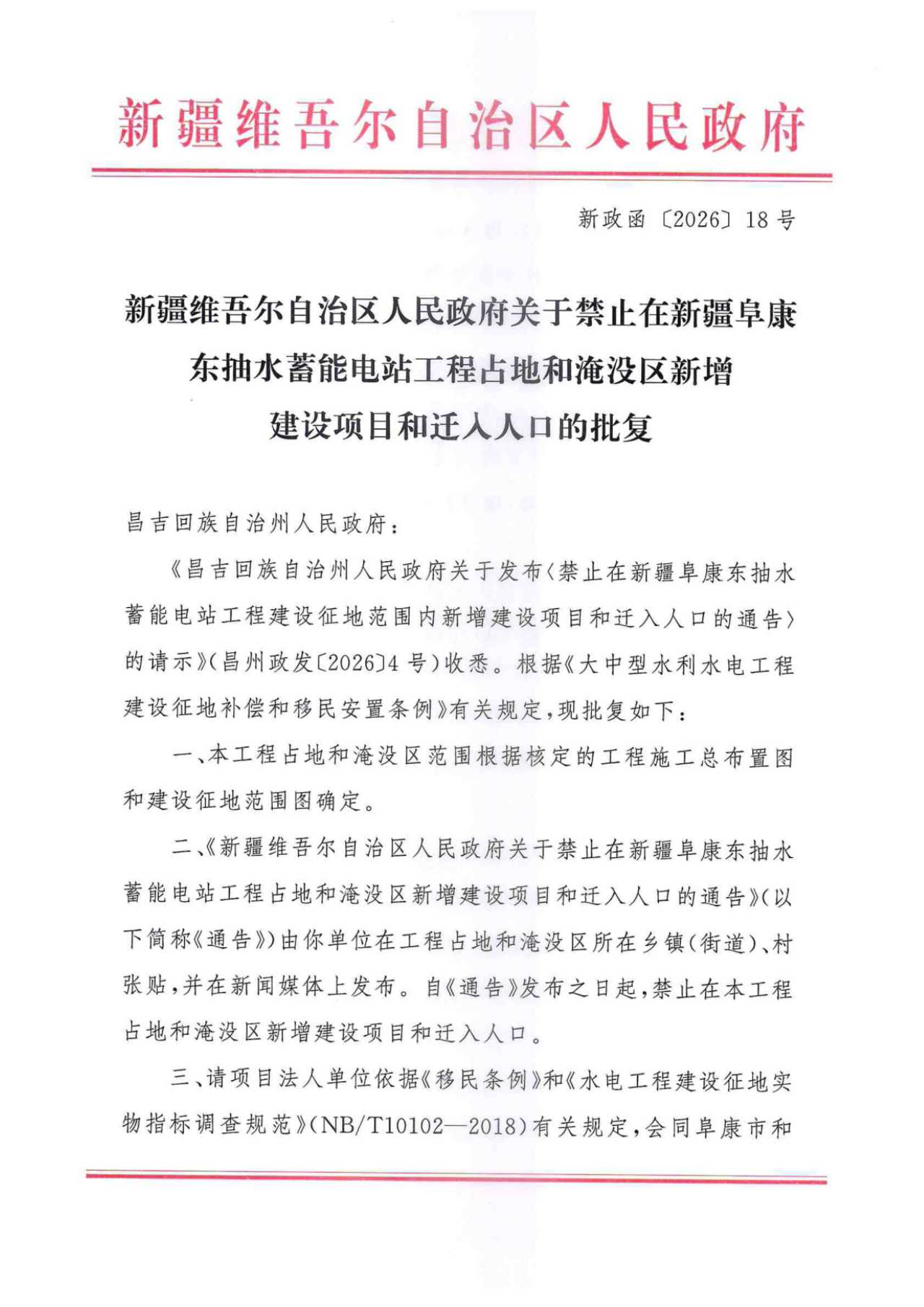 新疆维吾尔自治区人民政府关于禁止在新疆阜康东抽水蓄能电站工程占地和淹没区新增建设项目和迁入人口的批复