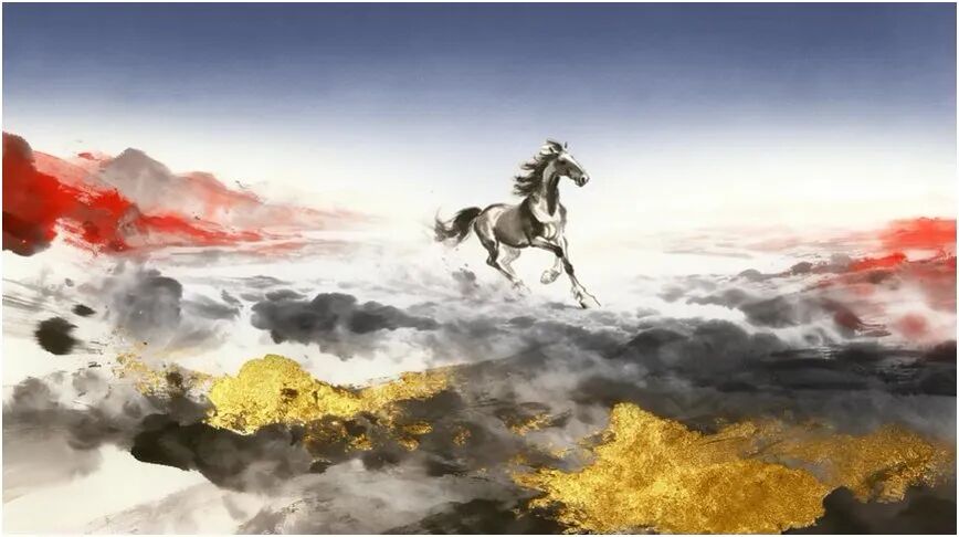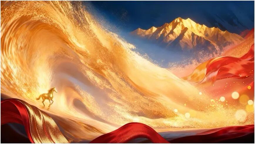 2026新疆国际春晚首创性地将徐悲鸿大师笔下的水墨骏马通过AICG“活化”,从画卷中奔腾而出,穿越天山、昆仑、丝路时渐变成金色,带着金色浪潮奔涌向前。骏马奔腾,既是新疆发展的速度与力量,更是中国精神的昂扬姿态。