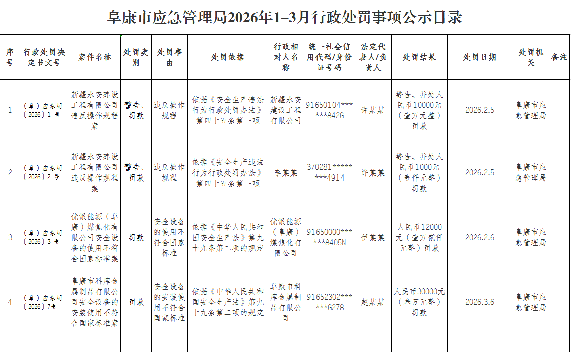[行政处罚]阜康市应急管理局2026年1-3月行政处罚事项公示目录