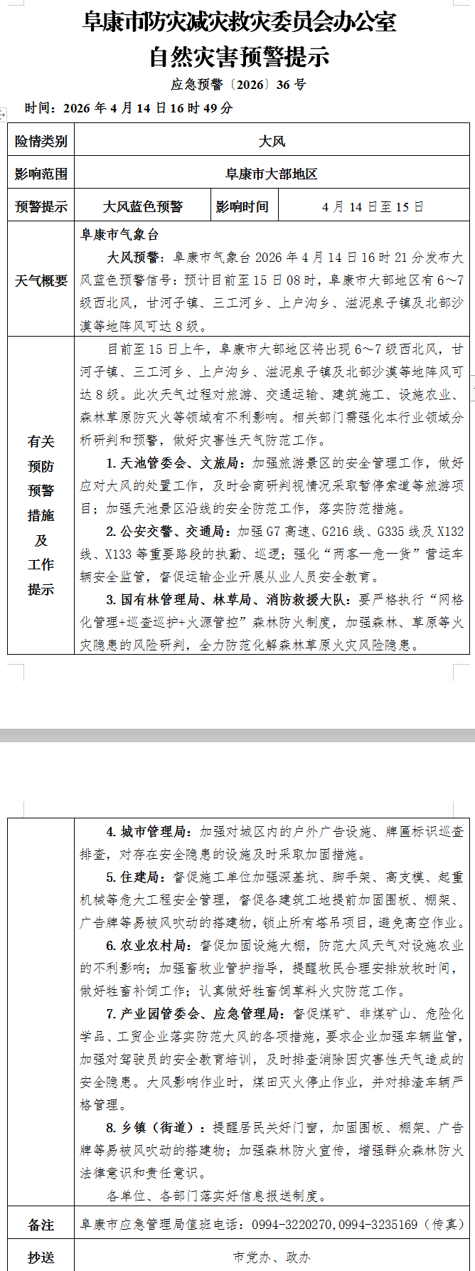 阜康市防灾减灾救灾委员会办公室自然灾害预警提示