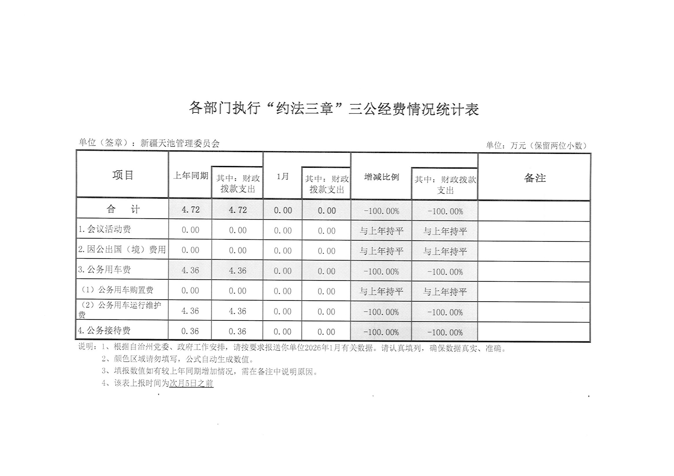 | 名 称 | 2026年新疆天池管理委员会执行约法三章“三公经费”情况统计表(1月) | ||