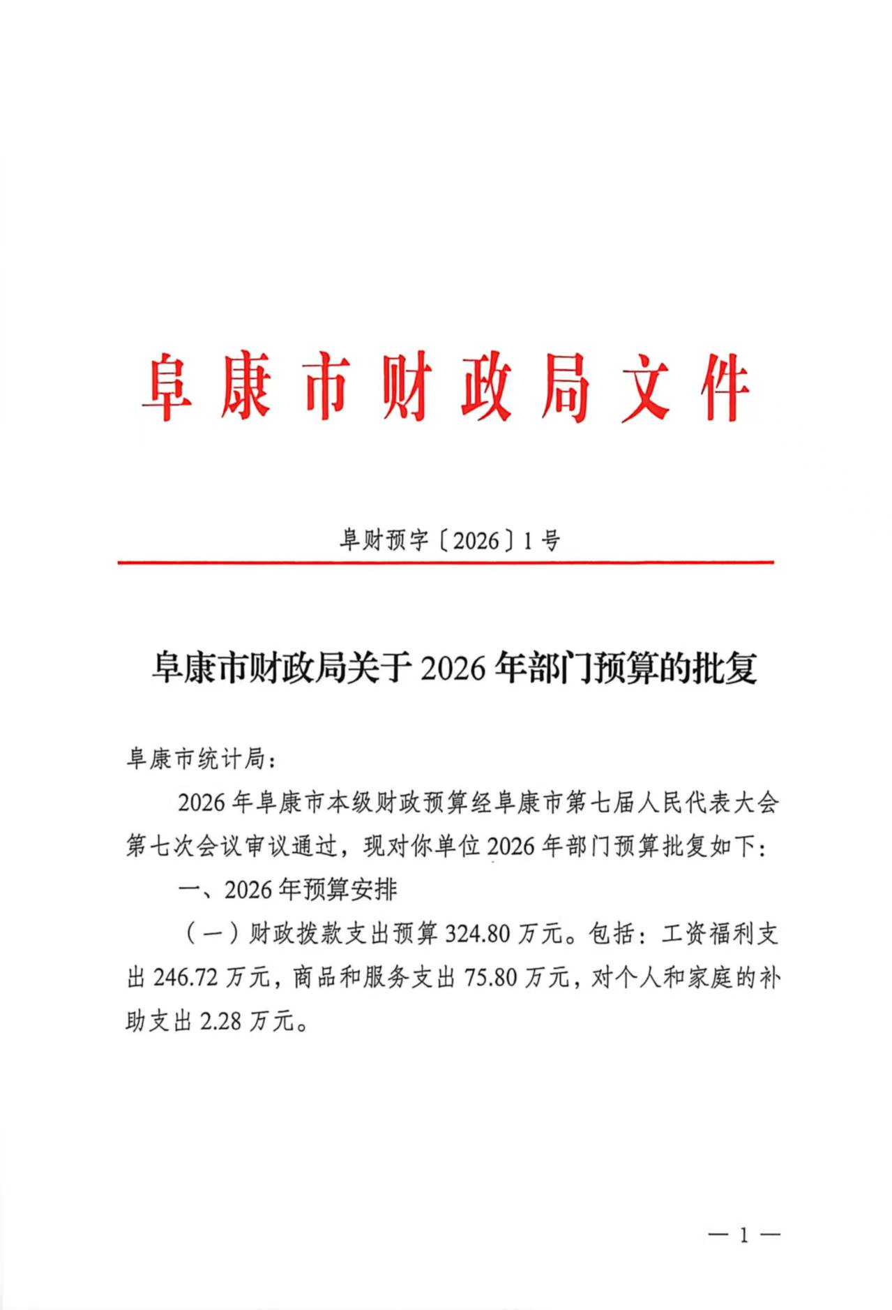 阜康市财政局关于2026年部门预算的批复