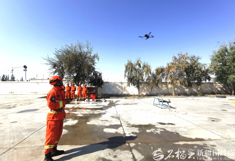 沙雅县森林草原消防应急分队演练无人机火情侦查,守护原始胡杨林(资料图片)。