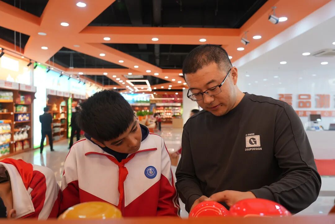 瑶池甄选展销中心工作人员向在场师生介绍,这里汇集了全疆11大类、300多种优质特产,是阜康市全域电商发展的核心平台,也是展示新疆特色、助力本地产业发展的重要窗口,并带领孩子们走进有机农产品、手工艺品等展区,讲解阜康本土及全疆特色产品的生长环境、产地特点和加工过程。孩子们手持研学任务卡,一边认真听、一边仔细记,对照任务要求打卡记录产品信息,还不时和同伴交流自己的发现。展区里,新鲜的葡萄干、核桃等初级农产品,与包装精美的深加工成品摆放在一起,直观的对比,让孩子们一下子就明白了“产业升级”的简单含义,全程师生文明有序,展现出良好的精神风貌。