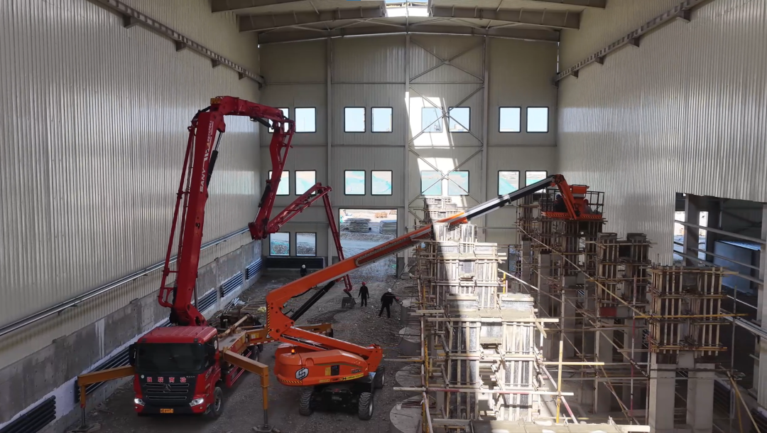 项目生产厂房内部,泵车、高空作业车等大型工程机械同步进场作业,全力推进厂房内部土建结构施工。宋文慧 摄