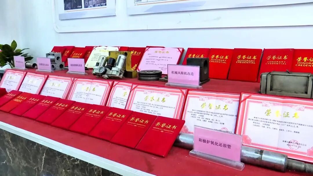在新疆五鑫铜业的依达亚提技能大师工作室的展示柜上,陈列着依达亚提・拜斯拉木和工作室成员们获得的各项荣誉证书。杨涛 摄