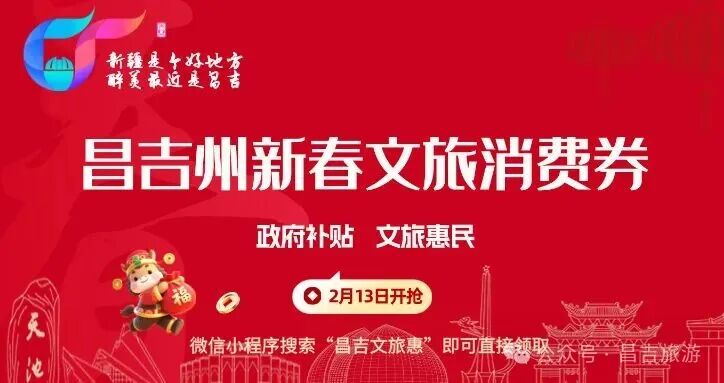 为抢抓2026年新春文旅消费旺季机遇,进一步激活昌吉州文旅消费市场活力,丰富新春文旅体验,释放消费潜力、拉动经济增长,昌吉州将发放300万元新春文旅消费券。发放详情如下: